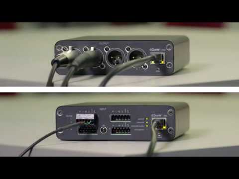 Interfaz de red de audio analogico a Dante con 4 entradas XLR (mic/linea), para conectar microfonos y fuentes analogicas convencionales a sistemas de distribucion de audio IP en instalaciones AV profesionales.
